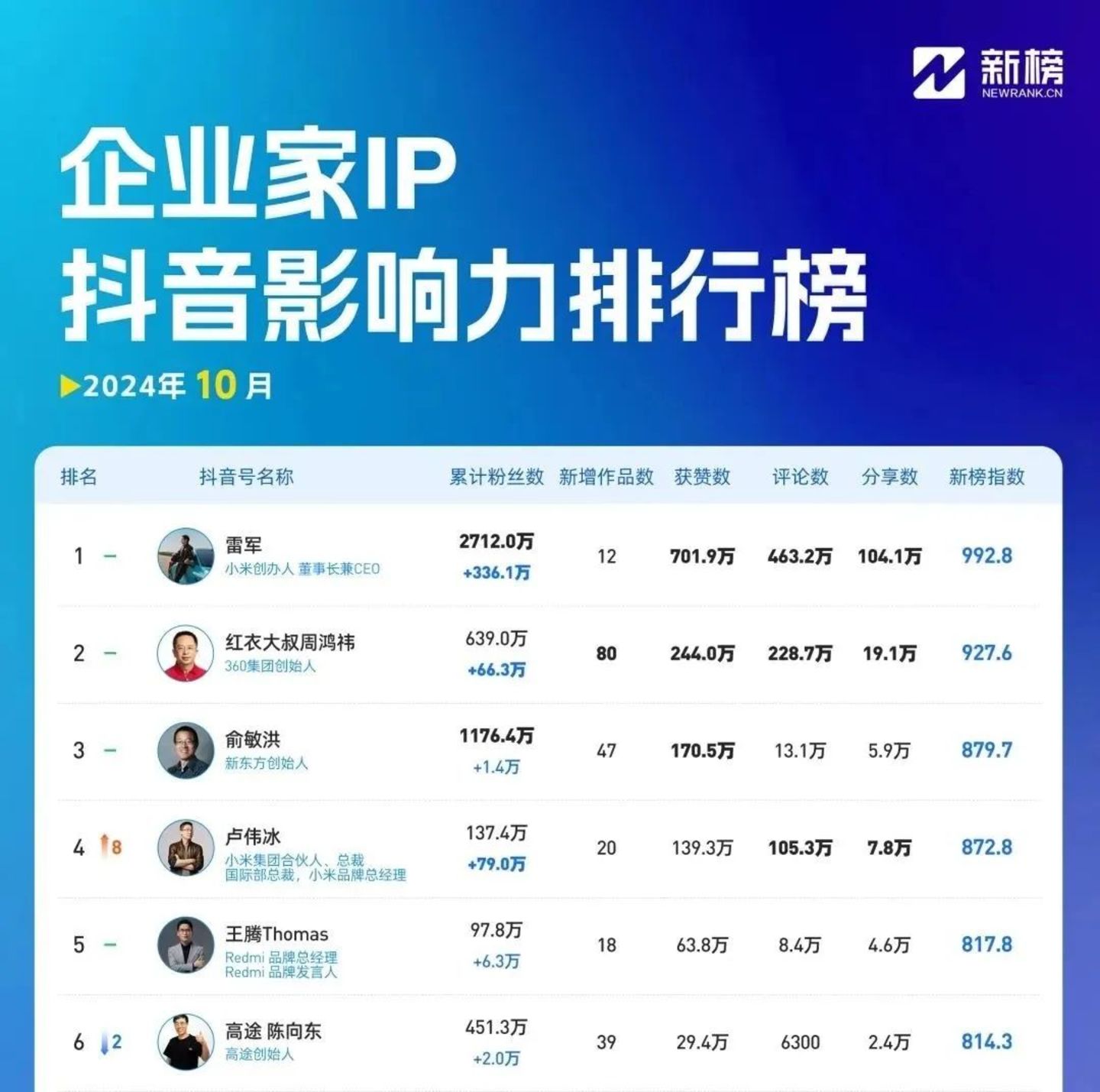 企业家们打造个人IP是为了在市场建立品牌信任和认知,快速传播企业文化和价值观。从新榜数据发布的《2024年10月的企业家IP抖音影响力榜单》来看,小米集团创始人雷军以单月粉丝增长超过336万夺魁,360集团创始人周鸿祎和新东方教育科技集团董事长俞敏洪。
