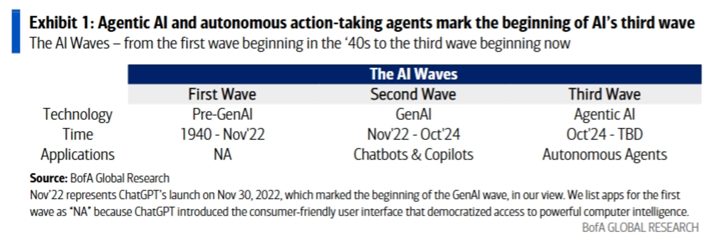 美国银行在研报中将AI的发展划分成三波浪潮:前GenAI、GenAI和Agentic AI。其中,前GenAI的时间是从1940年到2022年11月ChatGpt发布。在这个漫长的时间里,尽管也曾出现过Siri、Alexa、小爱、天猫精灵等语音助手,但AI的效用更多还是发挥在帮助不同场景实现数据驱动的趋势洞察和决策上。