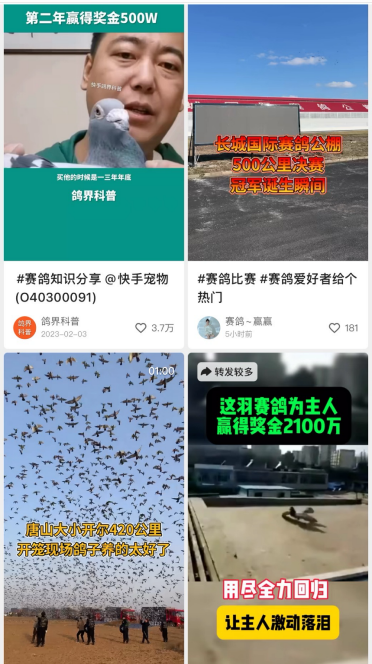 在赛鸽用户层面,平台不仅有爱好者鸽友、产业创作者,还有成规模的企业入驻,连同@中国信鸽协会的官方账号都在互联网平台,并活跃更新全国赛鸽赛事。