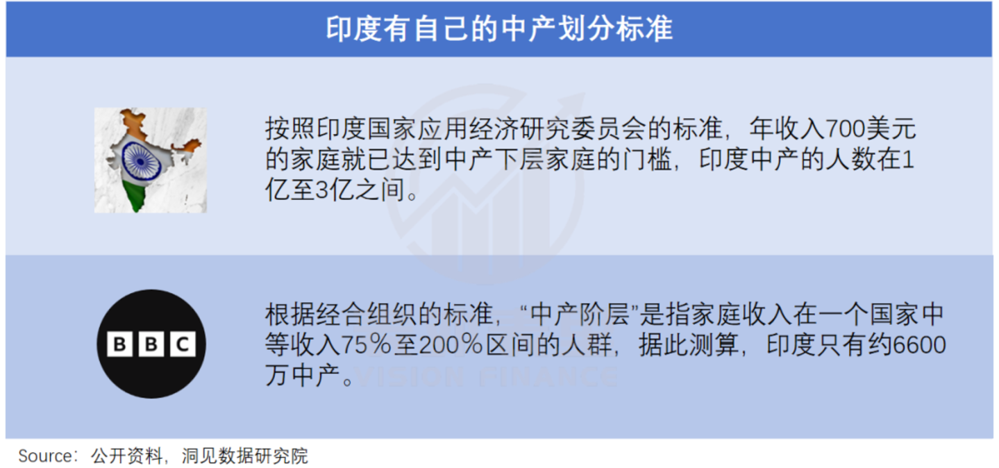 印度官方数据相对收敛,只有1-3亿人,但也是“自己定义的中产”,按经合组织的标准计算,印度中产仅6600万。