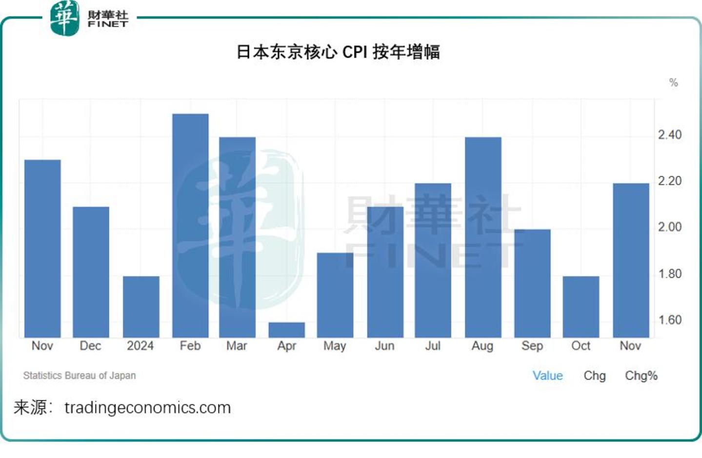 2024年11月,日本东京核心区的核心消费物价指数按年上升2.2%,高于十月的1.8%,这一增幅超出市场预期的2.1%,而且也是三个月以来最高的通胀读数。