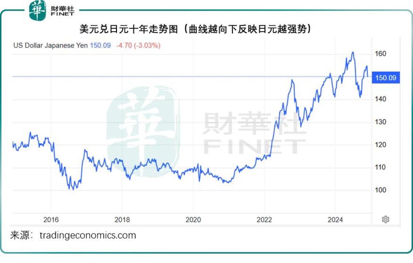 近日,日元兑美元汇价已走强至150日元关口,见下图,美元兑日元汇价,越倾斜向下,表明日元越强势。