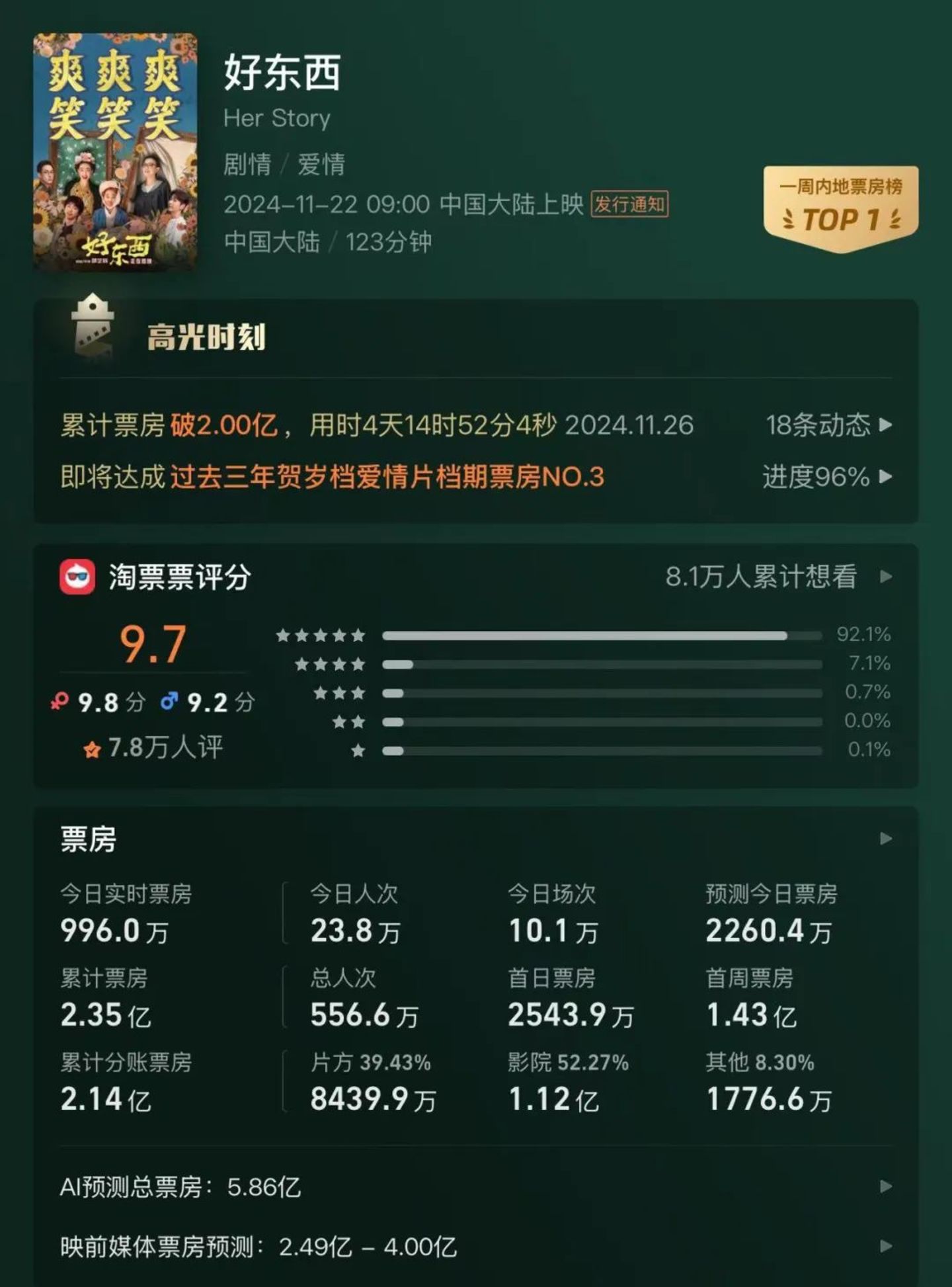 “新物种”顺利被市场接受。邵艺辉导演的第二部作品《好东西》豆瓣开分9.1后热度迅速攀升,不到一周累计票房已破2亿,预计最终票房能达到5-6亿以上,将成为11月的最大惊喜。
