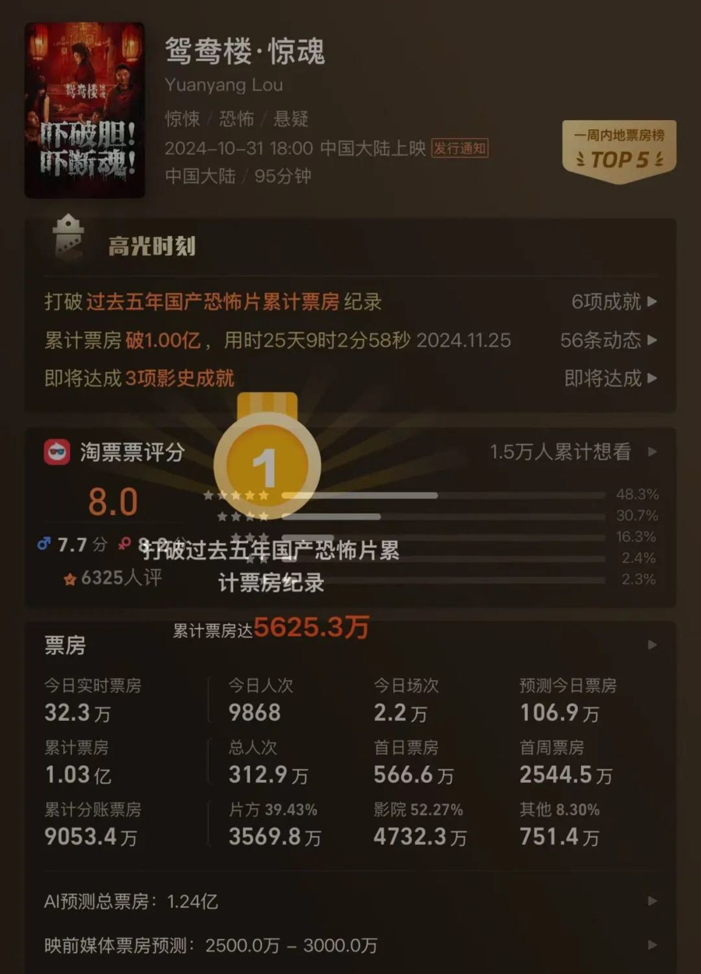国产“低分恐怖片”成年末最大黑马。李梦、苏小玎主演的国产恐怖片《鸳鸯楼·惊魂》累计票房破1亿,比前期媒体预测高了五、六倍,打破过去五年国产恐怖片票房纪录,上一次有国产恐怖片突破5000万票房还是2019年的《碟仙》,《鸳鸯楼·惊魂》在豆瓣、淘票票、猫眼的评分都大大低于其他影片。