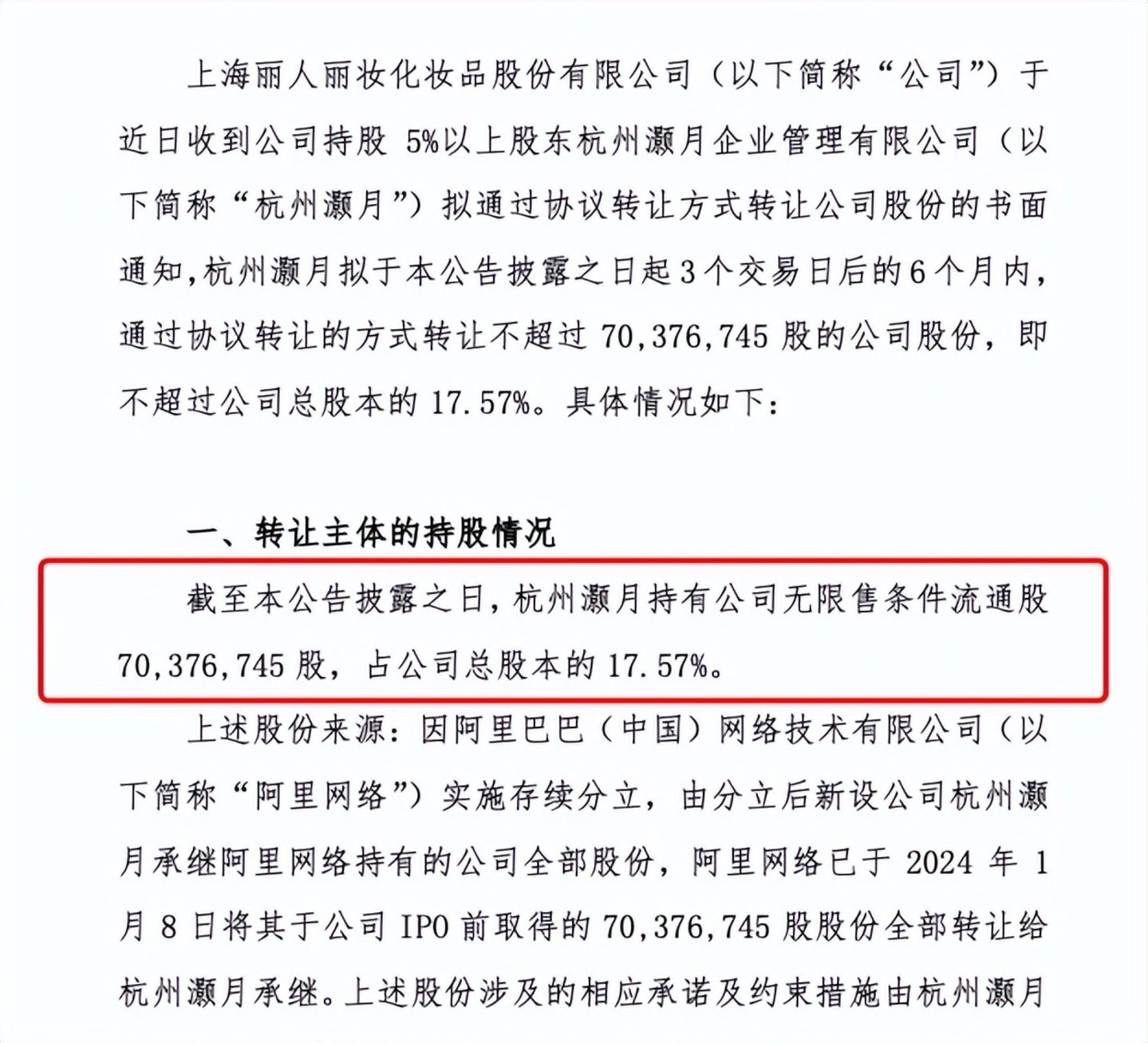 值得注意的是,杭州灏月系淘宝(中国)软件有限公司下属控股子公司,其对丽人丽妆的持股,全部来自于阿里网络因实施存续分立,后者于2024年1月8日将其于公司IPO前取得的7037.67万股股份全部转让给杭州灏月承继。