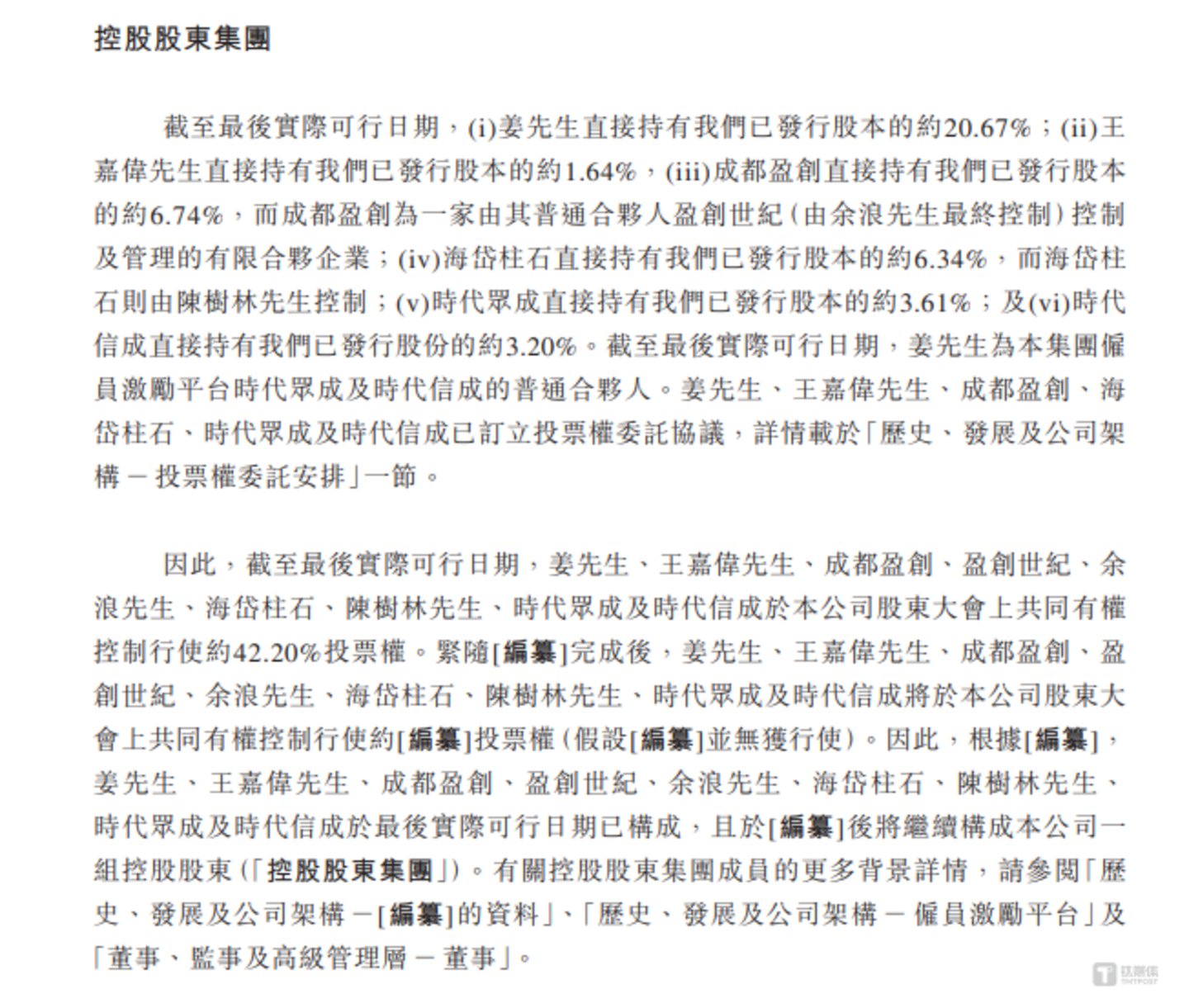 盛威时代成立于2012年,由姜生喜及仲彦洁出资设立。截至招股说明书签署日,姜生喜直接持有盛威时代20.67%的股权,并通过与王嘉伟(持有盛威时代1.64%股权)、成都盈创(持有盛威时代6.74%股权,由余浪最终控制)、海岱柱石(持有盛威时代6.34%股权,陈树林控制的企业)、时代众成(持有盛威时代3.61%股权)及时代信成(持有盛威时代3.2%股权)订立投票权委托协议,共同有权控制盛威时代行使约42.20%投票权,为盛威时代的控股股东。