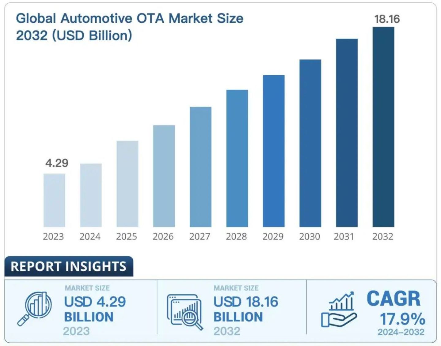 Business research insights预测,2023 年全球汽车 OTA 市场规模为 42.9 亿美元,到 2032 年将达到 181.6 亿美元,预测期内复合年增长率为 17.9%。这样的势头显露出,汽车OTA业务,用户有需求,企业有利润。