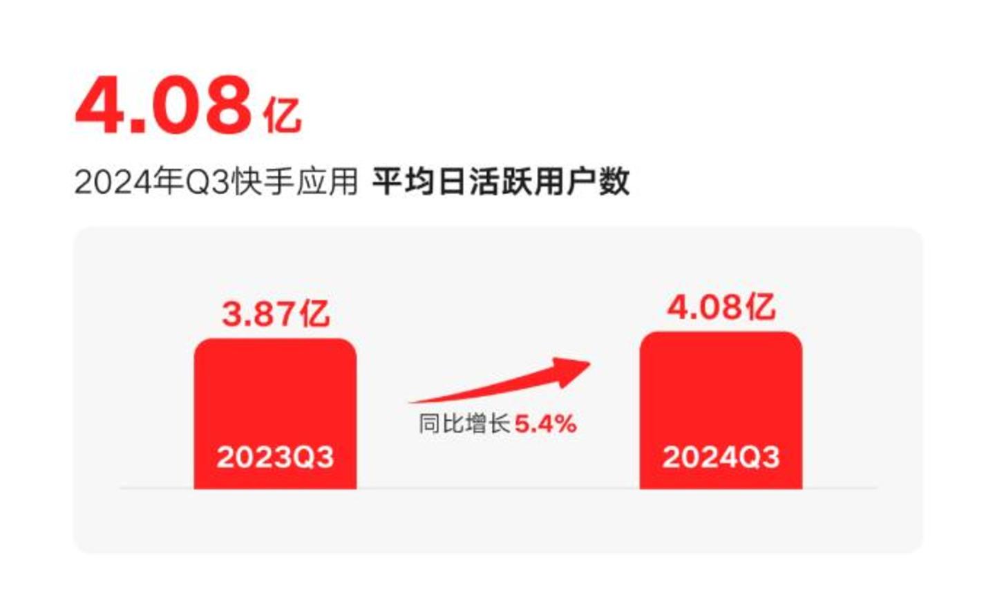快手2024年第三季度的DAU为4.08亿,环比增长3.29%,基本企稳,用户数据达到新高,可增速开始迟缓。拉长时间线,2023年一季度到今年三季度,快手DAU分别为3.74亿、3.76亿、3.87亿、3.83亿、3.94亿、3.95亿、4.08亿,处于增长缓慢、逐渐见顶的状态。