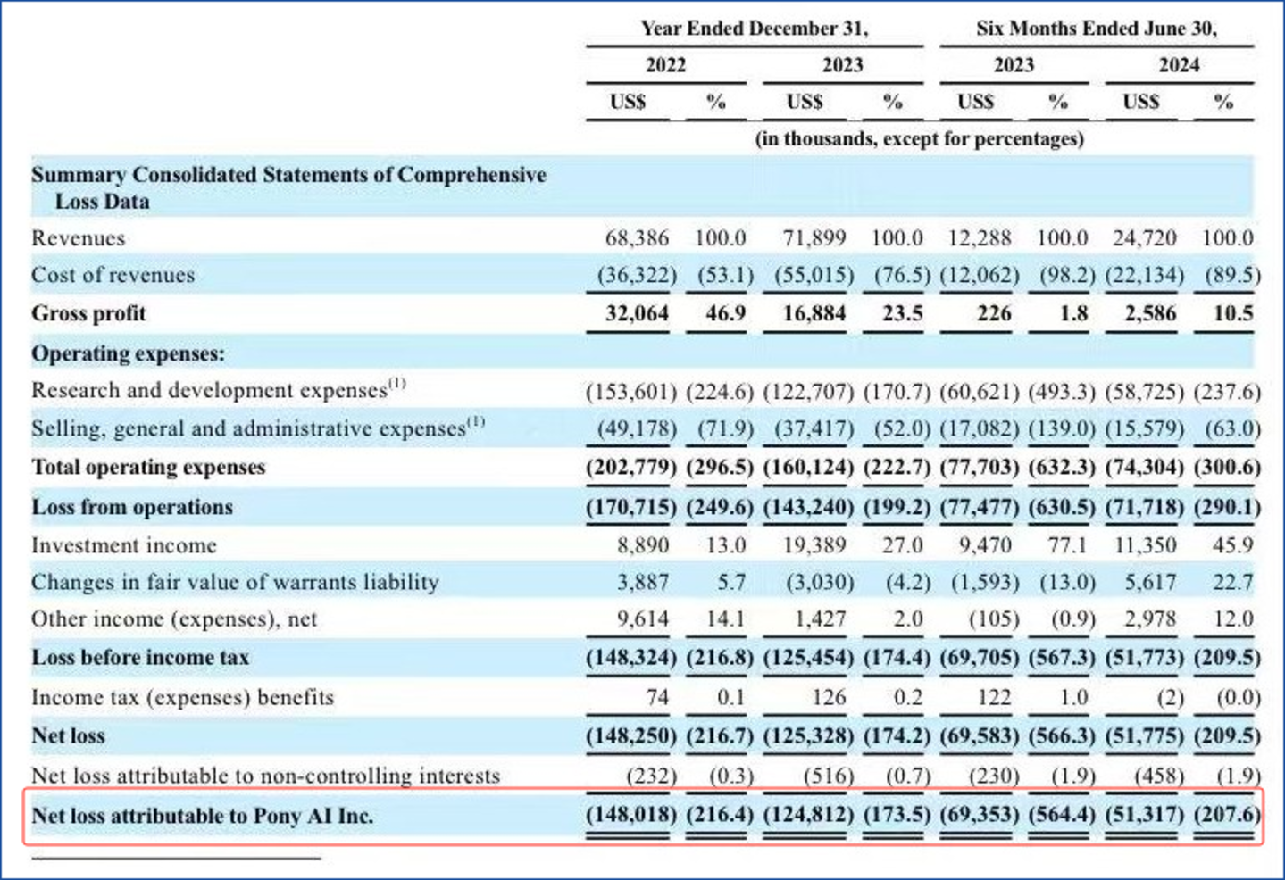 然而,自2022年至2024年上半年,Robotaxi的营收分别为896.7万美元、767.5万美元、116.8万美元,营收呈下降趋势。小马智行招股书并未针对此现象进行说明。结合无人出租车的市场情况来看,应该是与研发高投入、规模化程度不足有关,同期研发投入分别达到1.54亿美元、1.23亿美元以及5872.5万美元已经说明问题。