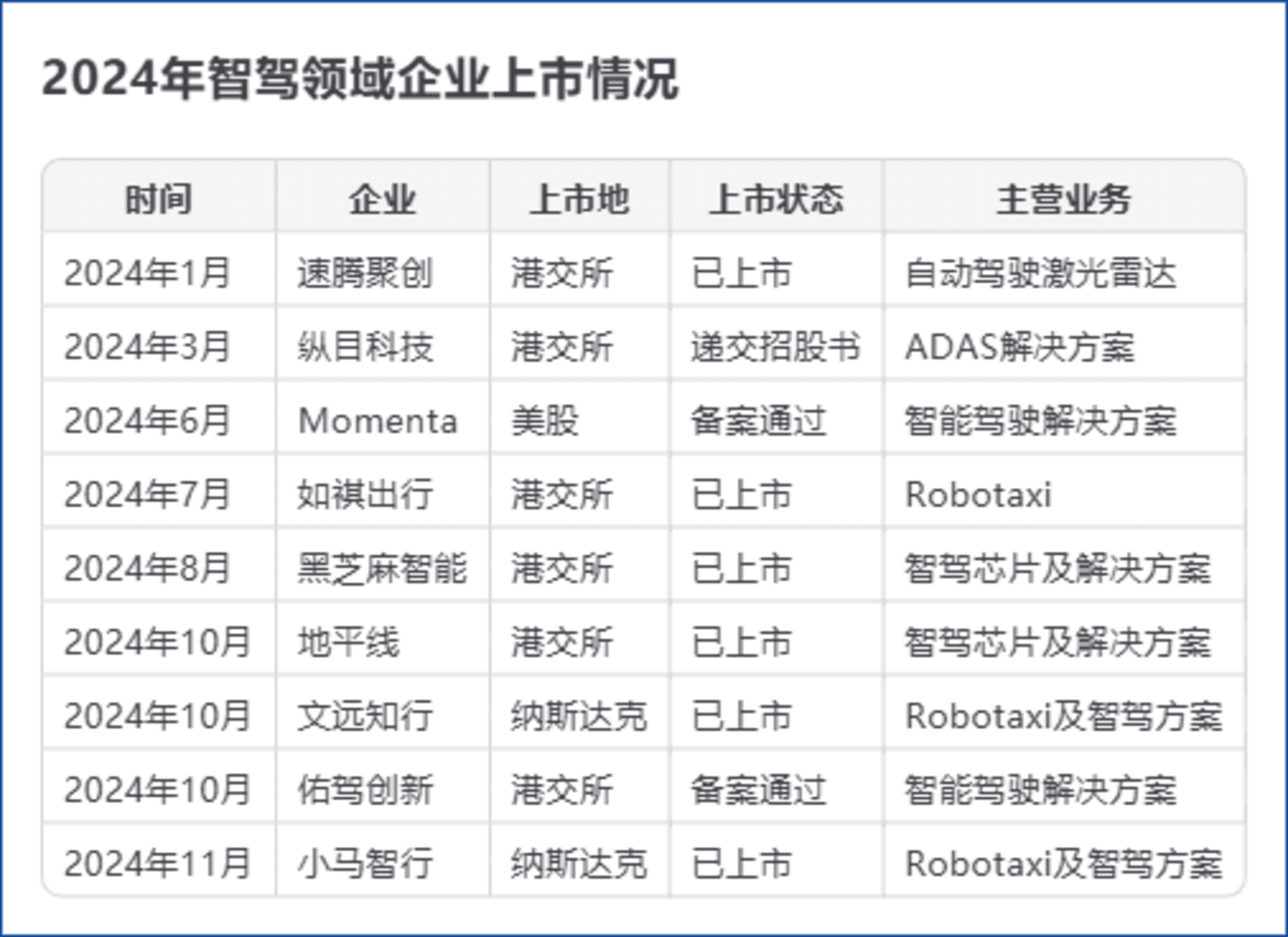 据公开资料显示,进入今年以来,已有9家中国智驾领域的企业在美股和港股上市,主营业务为Robotaxi的就有三家,分别是如祺出行、文远知行和小马智行。其中,如祺出行与小马智行是战略合作伙伴,双方共同运营一支合作车队,并非直接竞争对手。