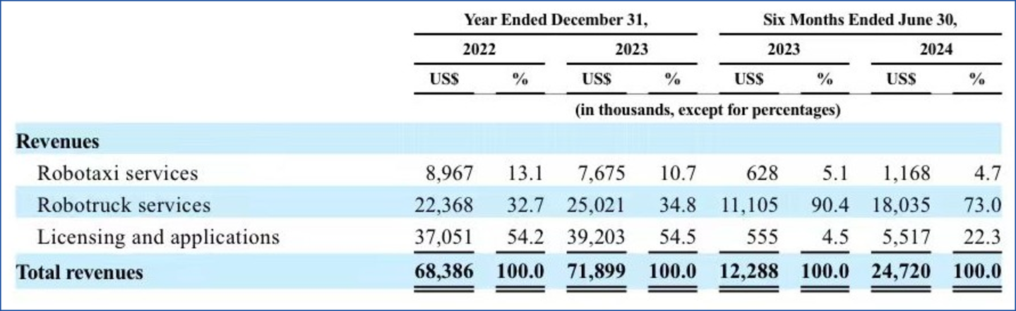 小马智行的业务分为Roboaxi(无人出租)、Robotruck(无人卡车)和技术授权与应用服务。其中,Robotruck业务增长最为迅猛,2022年全年收入占总营收比例为32.7%,但来到2024年上半年占比已经达到73%。而小马智行投入最大的核心业务Robotaxi,同期占比仅为4.7%。