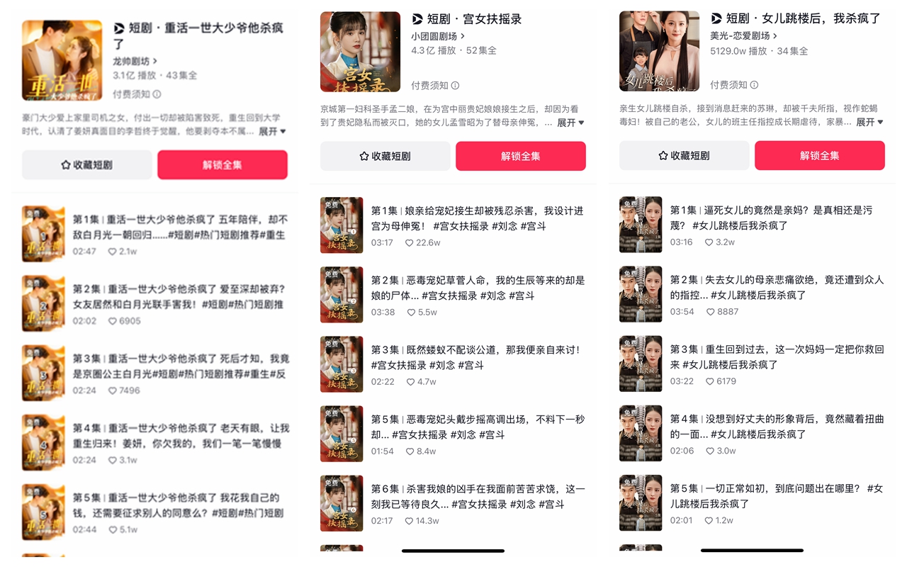 前述热门微短剧《重活一世,大少爷他杀疯了》即是一例。剧中原本的集团继承人衣衫褴褛地从救助站出来,才知道是自己喜欢的人陷害自己、抢走公司,还害得自己感染艾滋。这部微短剧共43集,单集时长2-3分钟,第三集主角就病发死去,然后重生回到学生时期,开始复仇。类似的微短剧还有《重生九零少爷杀疯了》《逆袭之我和重生男主暴虐渣渣》等等。