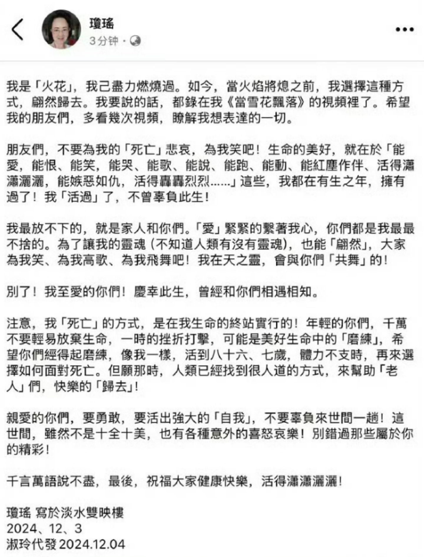 琼瑶在社交媒体更新了一则“遗书”称:“我是‘火花’,我己尽力燃烧过。如今,当火焰将熄之前,我选择这种方式,翩然归去。我要说的话,都录在我《当雪花飘落》的视频里了。希望我的朋友们,多看几次视频,了解我想表达的一切。”
