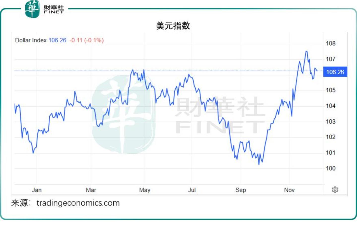 在这样的背景下,尽管美联储的降息周期正徐徐展开,而日本央行在12月加息可能性推动日元汇价造好,也无碍美元指数的攀升,见下图,美元指数仍保持在106以上水平。
