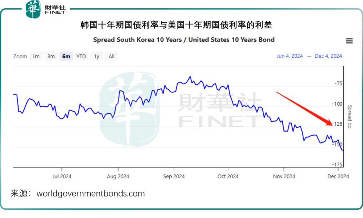 财华社留意到,事件发生后,韩国十年期国债息率与美国十年期国债息率的利差进一步扩大。