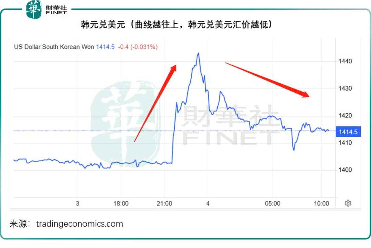 深夜突发,韩元惊魂一跳后,目前暂时稳定下来,但是相较之前的走势仍然偏低,见下图美元兑韩元汇价走势,在晚上韩总统宣布戒严时,韩元兑美元一度跌破1443水平,但现在已回到1414,但仍较事发之前的1400水平低。