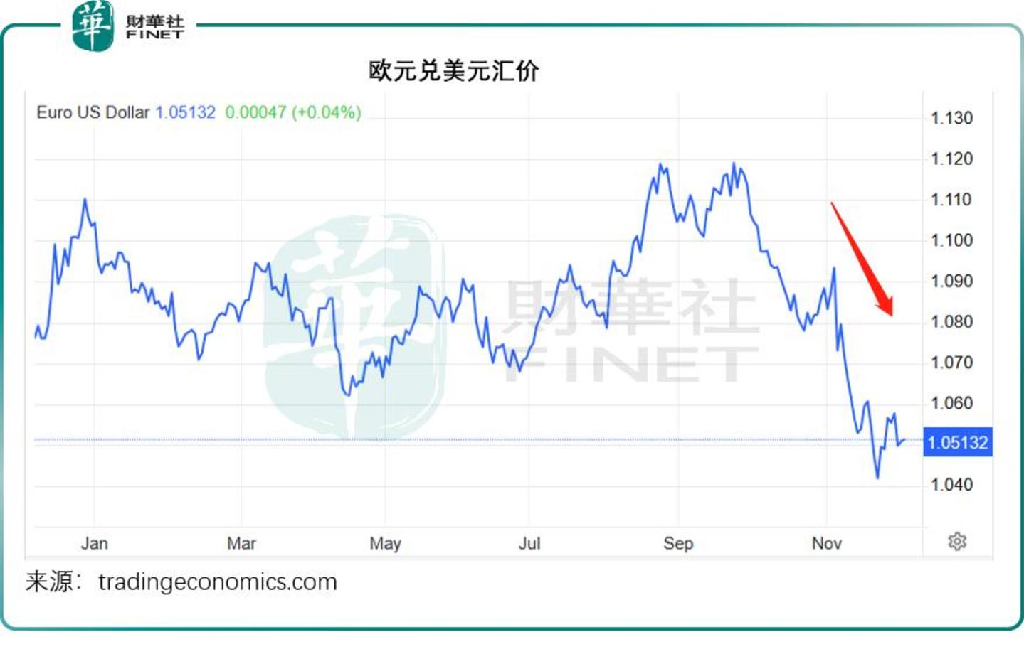 欧元兑美元汇价持续向下,从9月下旬的阶段高位1.119跌至当前的1.051,跌幅达6.1%,见下图。