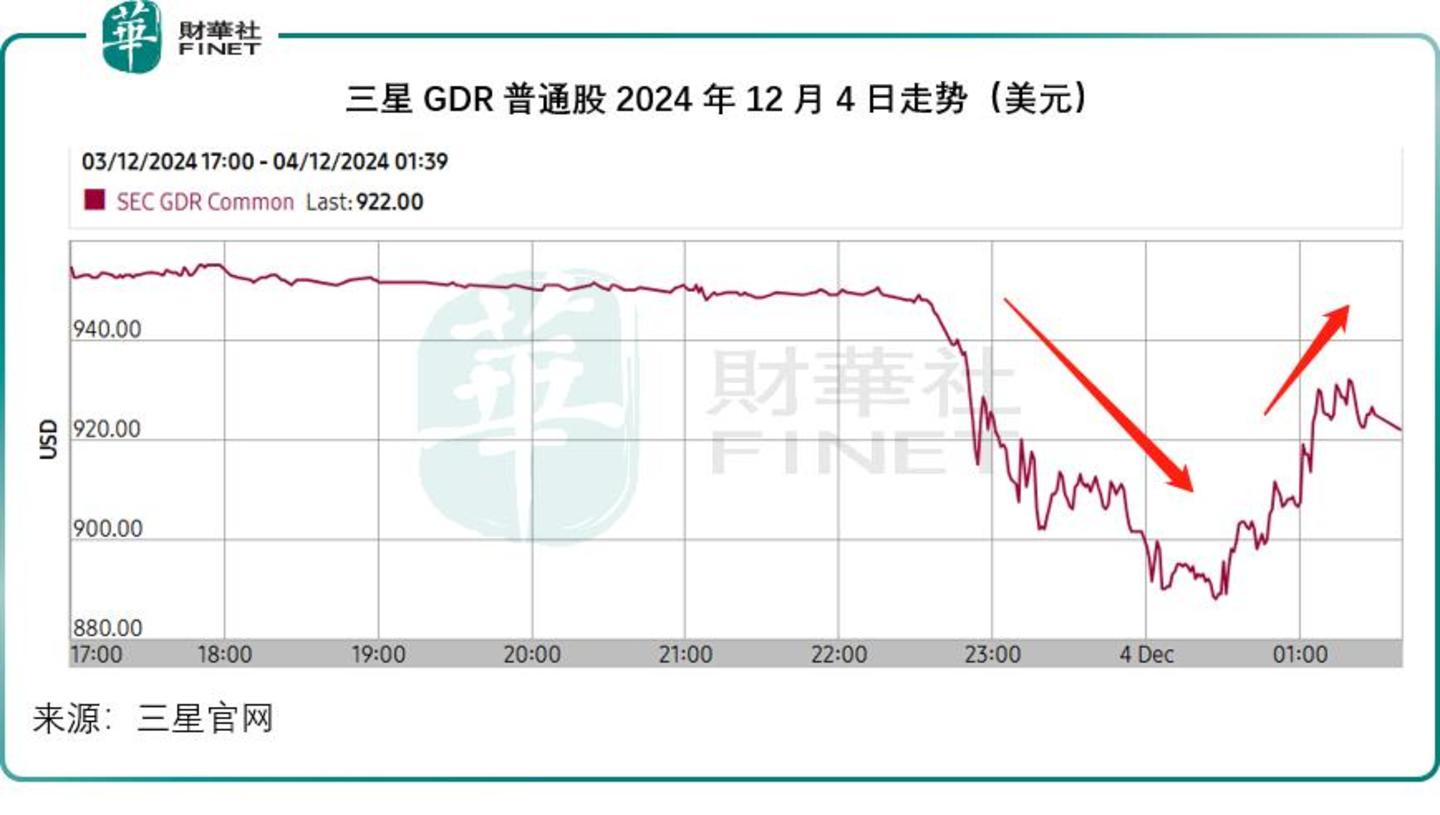受事件影响,在欧美时间交易的韩国资产率先跳水,在伦交所上市的三星GDR(全球存托凭证)一度大跌,不过很快修复部分失地,见下图。