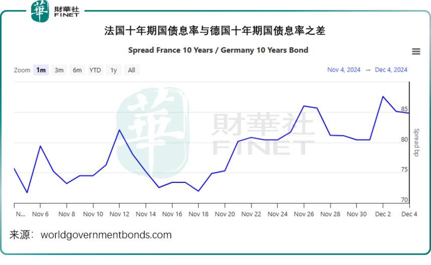 尽管受中国消费信心正逐渐恢复,以及美国减息可能提振消费带动,LVMH和爱马仕等高端消费品股微升带动了法国股市走势,但法国国债息率与德国国债息率利差进一步扩大。 这一利差或反映法国相对于德国的风险溢价——因两国使用同一货币欧元,利差陡然扩大意味着个别国家的风险陡增——显示出国际资金对于法国潜在风险的担忧。