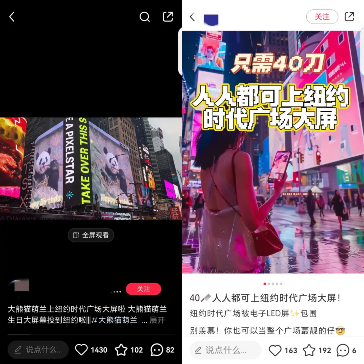 孟晓骏需要靠公司上市登上纽约时代广场,但现在,只要40美元(约290元人民币),就能在纽约时代广场播放15秒自己的视频。淘宝、闲鱼或者小红书等平台上,还可以找到不少中介提供代下单服务和现场录播服务,一度让众多中国网友带着家人、好友或是猫狗,在纽约时代广场给美国人一些“中国震撼”。