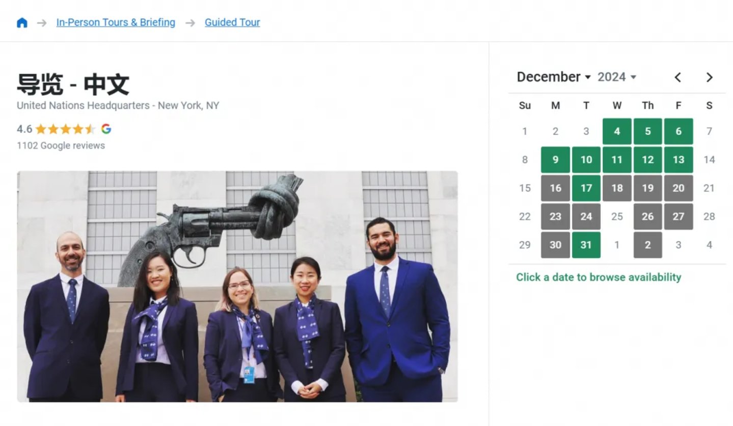 目前,联合国导游服务支持英语、中文、法语和阿拉伯语等13种语言——官网显示,12月有不少天的中文导游服务已经售罄。不会预约也没关系,淘宝、飞猪和闲鱼等平台上,还有不少旅行社和“代下”能帮忙预约联合国导游服务,淘宝上有商家卖出36单,而闲鱼一个代下近期就收到了71个“想要”的咨询。