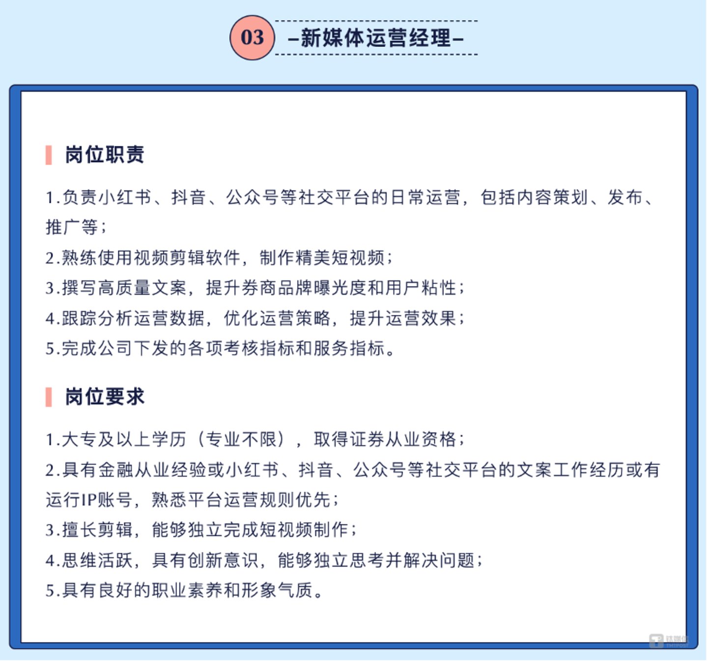例如中国银河证券股份有限公司招聘新媒体运营经理,就要求主要负责小红书、抖音以及公众号的日常运营,然而这个岗位更偏向于自媒体运营,对于专业知识的要求较低,对学历的要求是大专及以上学历。
