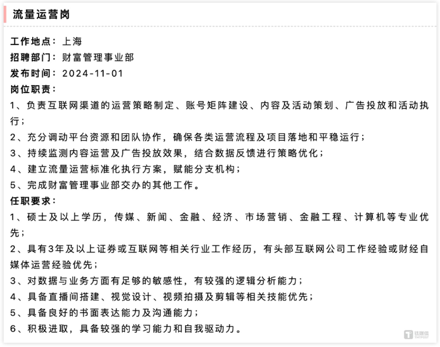 再看申万宏源证券有限公司投放的流量运营岗,岗位要求互联网渠道的运营策略制定、账号矩阵建设、内容及活动策划、广告投放和活动执行等,任职要求对于学历和专业要求更偏文科,要求硕士及以上学历,传媒、新闻、金融、经济、市场营销、金融工程、计算机等专业,同时要求候选人具备直播间搭建、视觉设计、视频拍摄及剪辑等相关技能,对岗位所需的技能不仅仅是新媒体运营,还需要候选人有金融相关知识以及数据分析能力,这一要求就相对较高了。