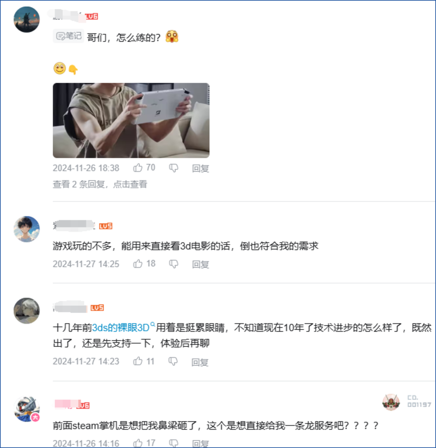 3D One掌机发布后,网友评论呈两极分化。吐槽的点主要集中在尺寸较大、机身较重,难以长时间手持玩游戏;但也有网友对裸眼3D屏幕的效果表示期待。