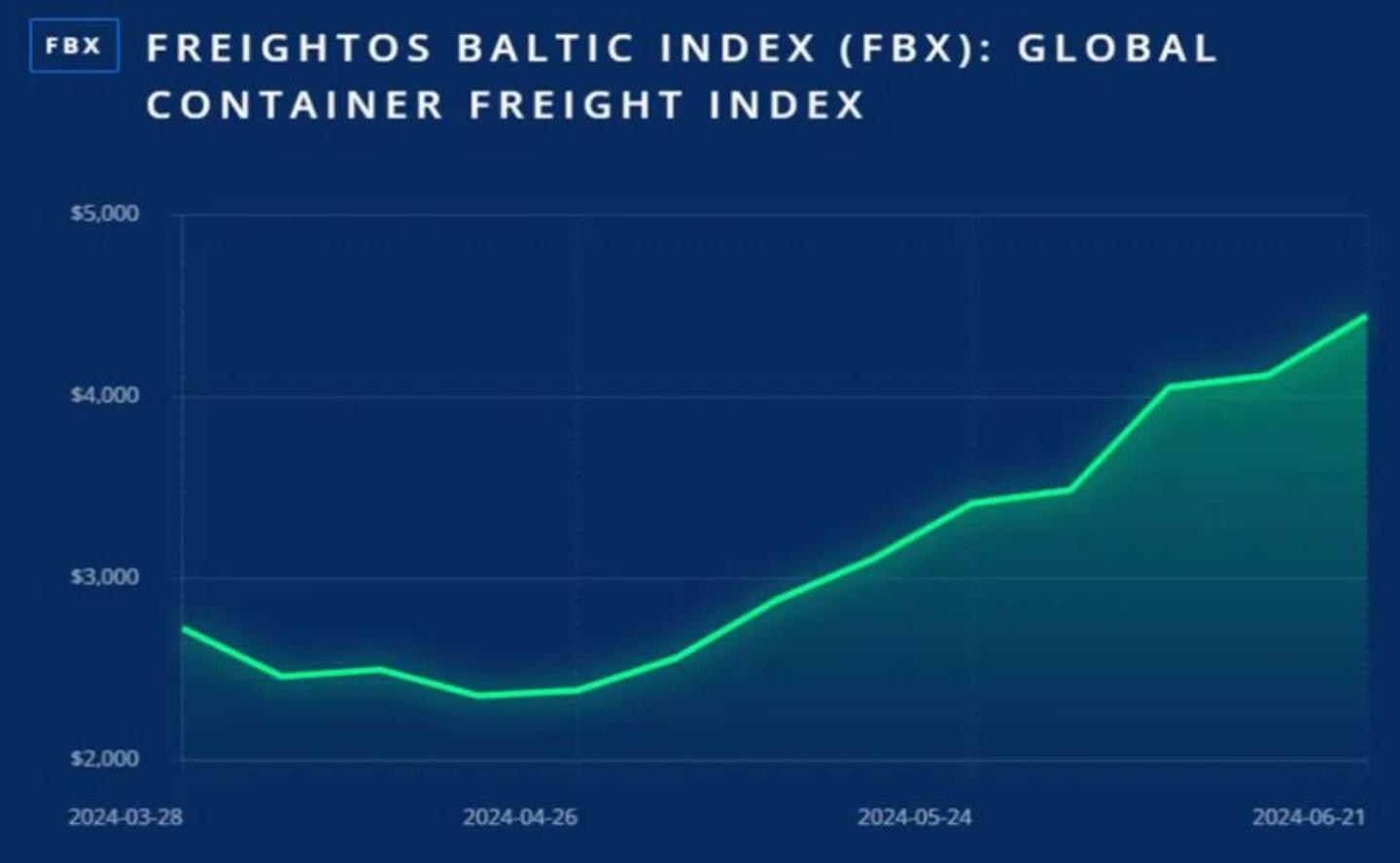 尽管宜家中国已经尽可能在增加本土化采购的比例,它仍然有相当比例的原料和商品需要采用跨国物流。而由于地缘政治、红海冲突等原因,根据主要航线集装箱现货价格指数FBX ,国际海运运费从 2023 年的每趟约 1200 美元上涨到今年6月的近 4500 美元。相比而言,国内品牌显然不用在这方面太过发愁。