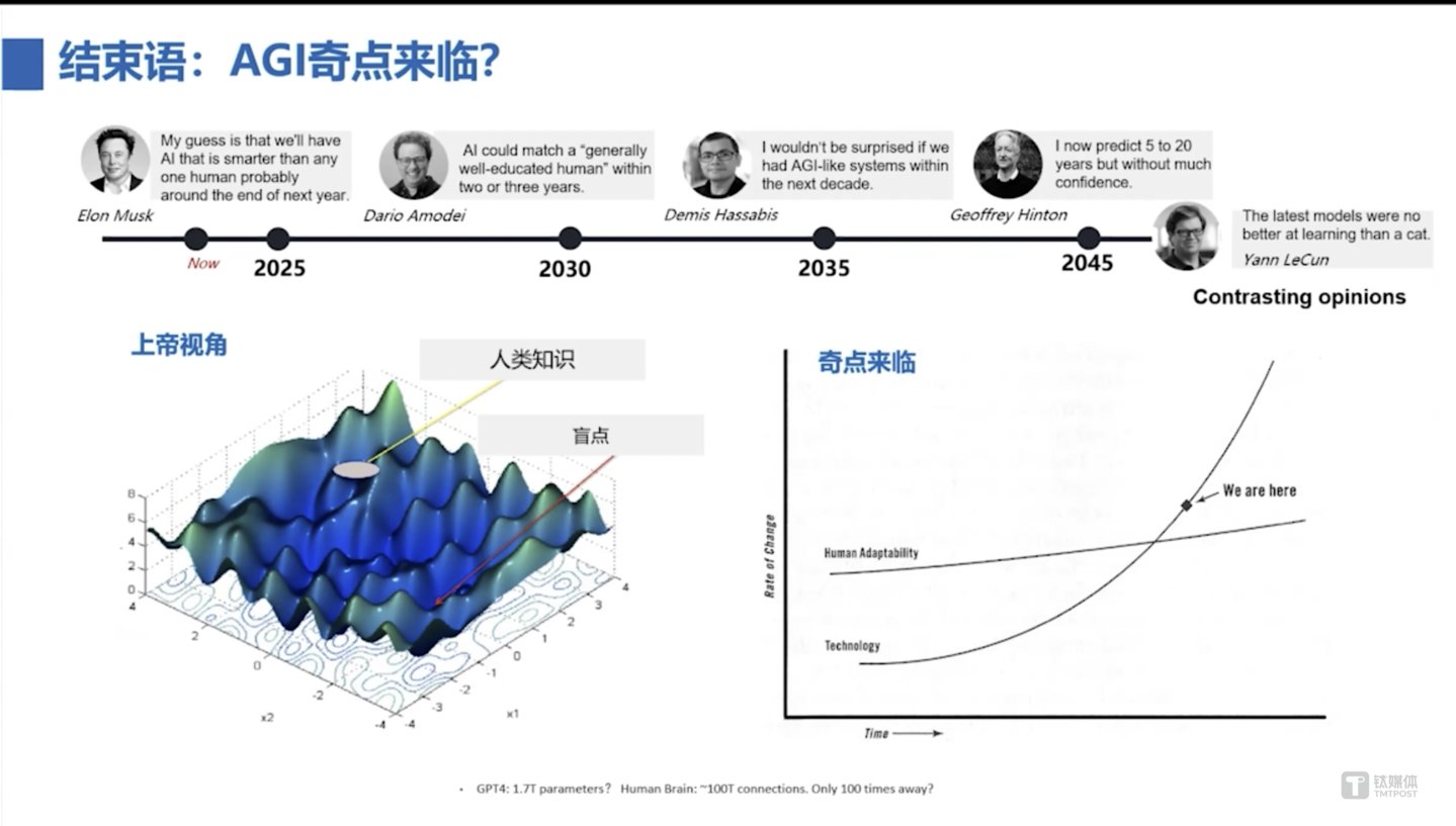 如果你要问马斯克(Elon Musk),他说已经到了;如果问美国AI大模型独角兽Anthropic CEO Dario Amodei,他说2026年;如果你要问谷歌DeepMind CEO Demis Hassabis,他说可能还有十年;如果问辛顿(Geoffrey Hinton),他说还有5-20年。