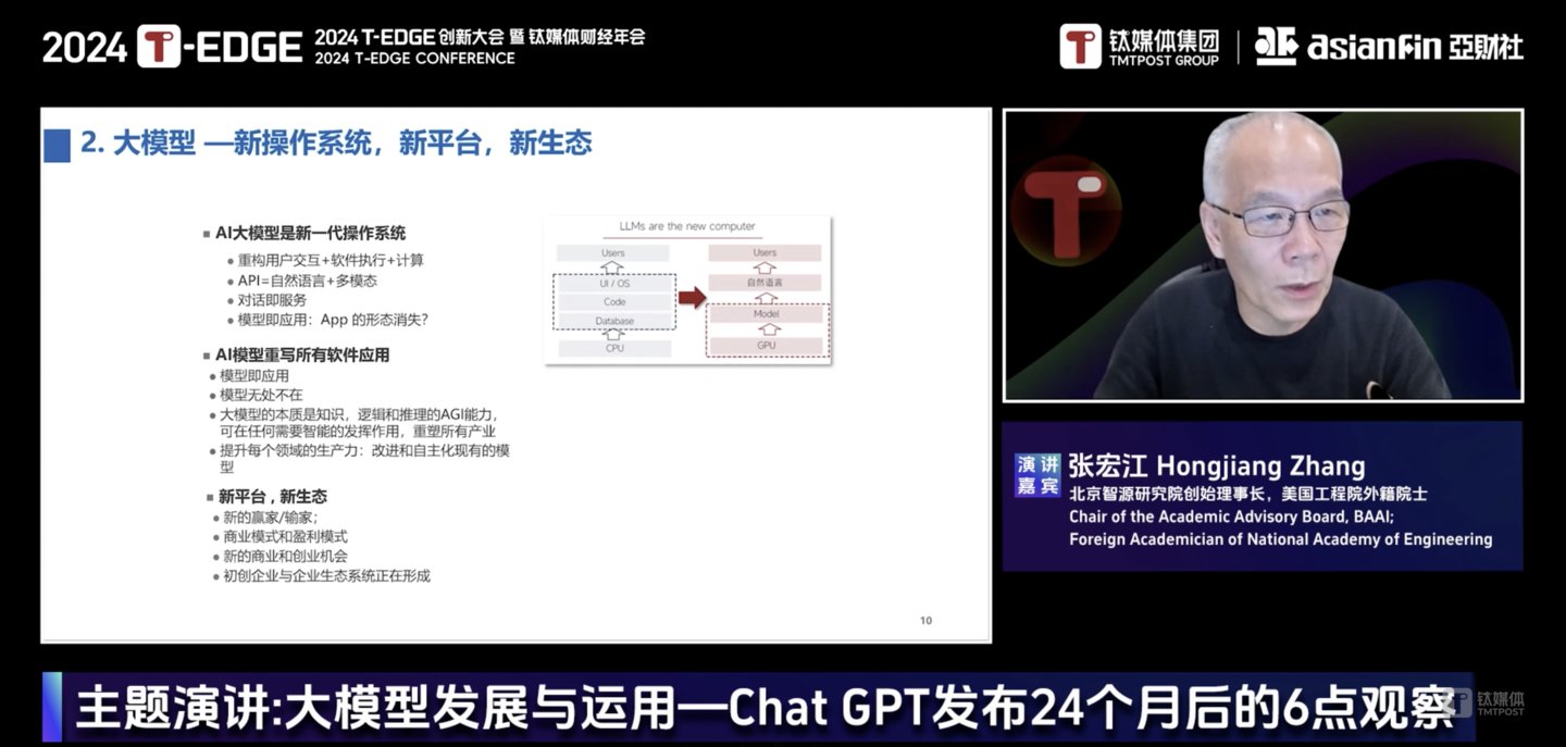 张宏江在T-EDGE大会上曾指出,所有的软件公司都必须拥抱大模型,包括软件工具、应用服务等类型企业,都需要启用大模型重写软件。