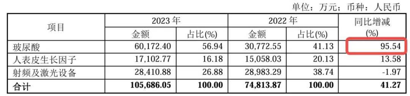 医美跃居第一大业务,玻尿酸功不可没。2023年,玻尿酸收入6.02亿元,同比增长95.54%,占医疗美容与创面护理业务的56.94%,成为该业务板块占比最多、增长最快的产品。