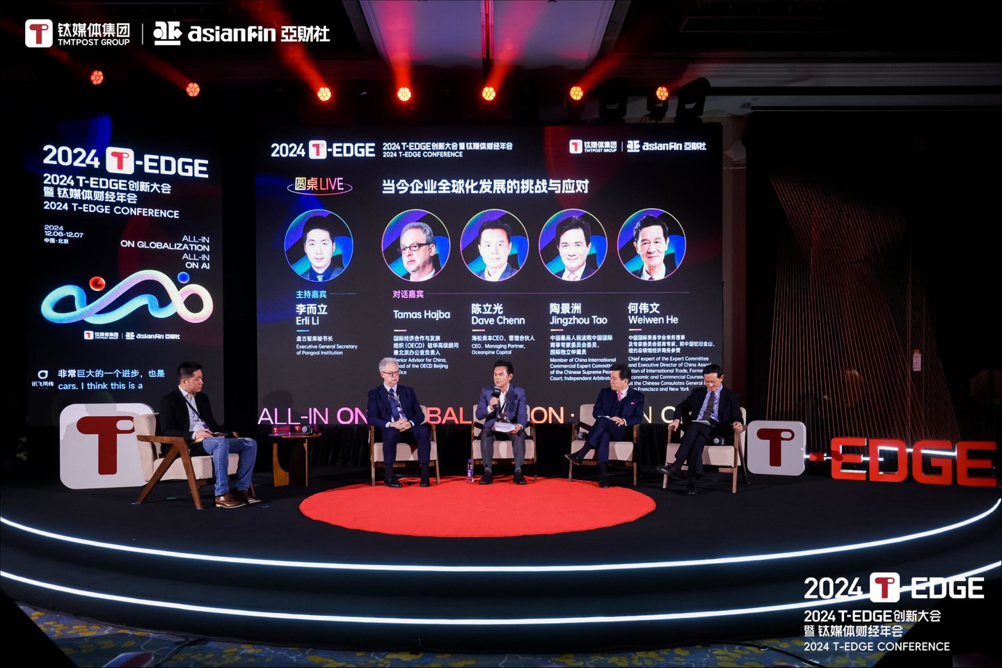 12月6日-7日,以“ALL-in on Globalization, ALL-in on AI”为主题的2024T-EDGE创新大会暨钛媒体财经年会在北京市大兴区举办,首日“全球增长论坛”聚焦全球经贸格局的演变与中国的机会。在当日上午的主题圆桌环节,国际经济合作与发展组织(OECD)驻华高级顾问兼北京办公室负责人Tamas Hajba 海博、海松资本CEO、管理合伙人陈立光、中国最高人民法院中国国际商事专家委员会委员、国际独立仲裁员陶景洲和中国国际贸易学会常务理事及专家委员会首席专家,前中国驻旧金山、纽约总领馆经济商务参赞何伟文,围绕“当今企业全球化发展的挑战与应对”展开讨论。盘古智库秘书长李而立主持了圆桌论坛。