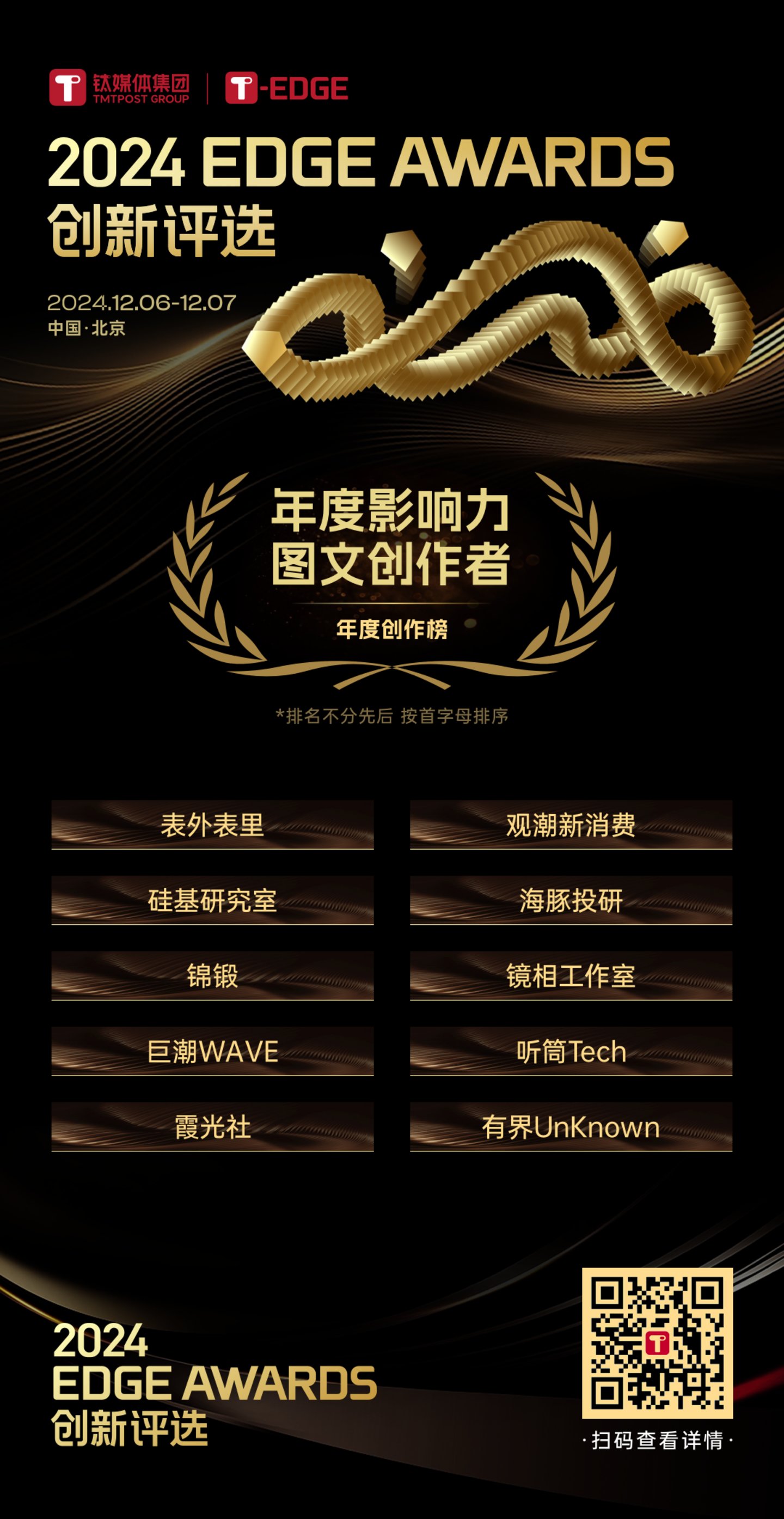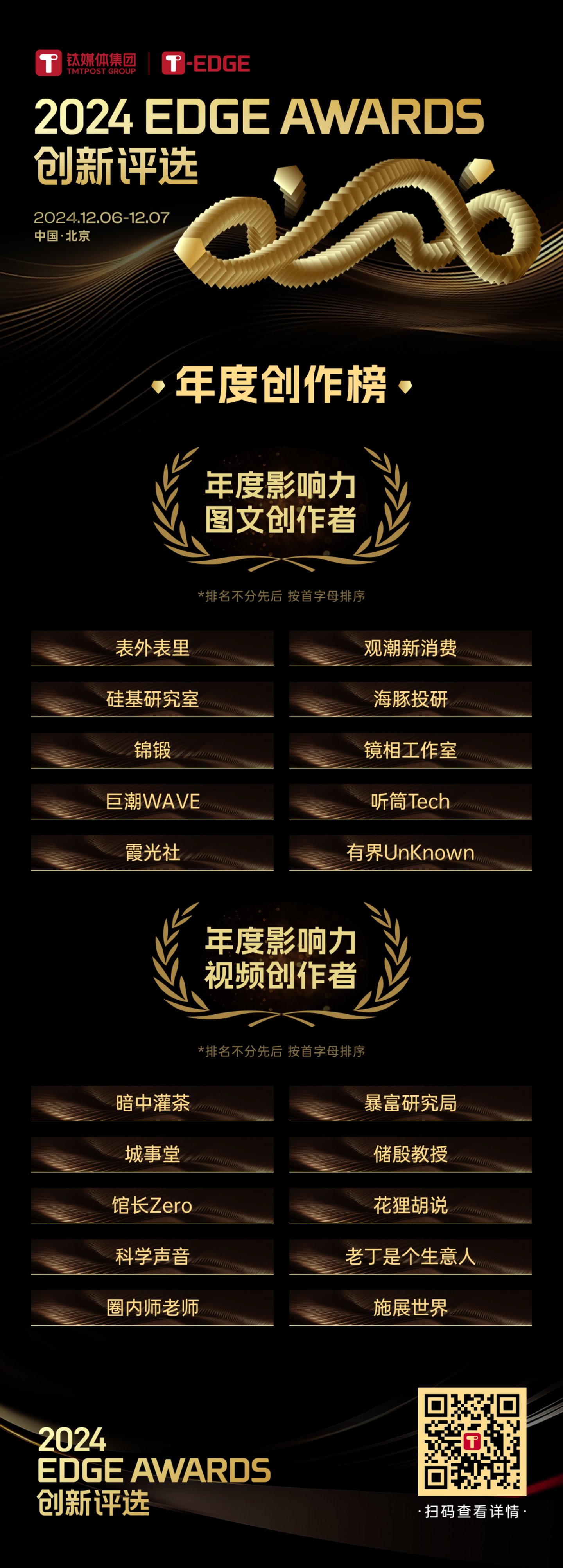 「2024影响力年度创作榜」,我们颁给本年度(2023年12月至今)坚持原创、深耕某一领域并具备行业洞察的「钛度号」创作者。他们或是刚刚崭露头角的自媒体新秀,或是已在行业享有盛誉的资深团队。本年度,他们坚持客观、独立思考、笔耕不辍,凭借各自对财经、商业、科技等领域的深度洞察与解读,为钛媒体平台持续贡献优质原创内容,成为当之无愧的「钛度号」影响力创作者。
