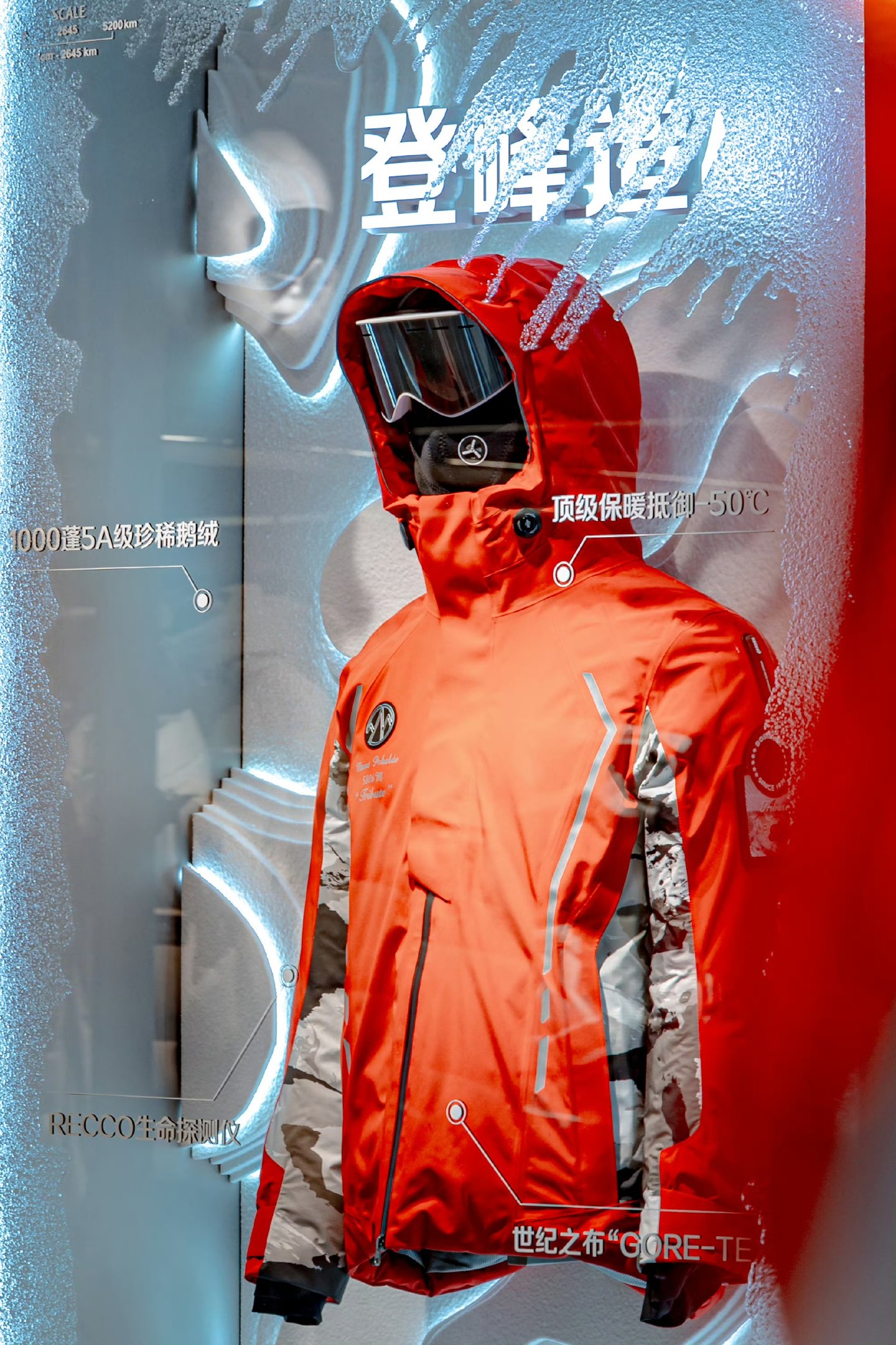 概念店一层“顶峰相见”展区,象征登峰之旅的起点。这里陈列着波司登的核心产品线——登峰系列、极地极寒系列、高端户外系列与高端商务系列。多处装置设计均为“登峰精神”提供了可视化的表达,例如仿造珠峰北坡路线的“启程”装置,用灯光和影像技术展现攀登过程中的每一步艰辛;还有倒吊的珠峰模型,配合镜面反射,让消费者从不同角度欣赏这一地球之巅的雄伟,同时象征波司登对更高维度追求的无限可能。