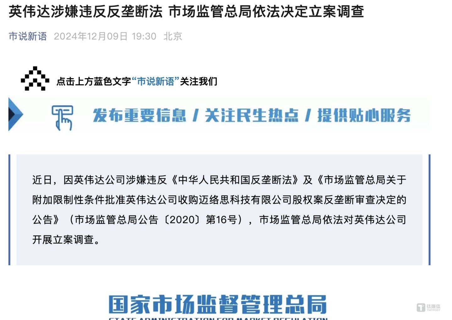 据央视新闻12月9日晚间报道,近日,因英伟达公司涉嫌违反《中华人民共和国反垄断法》及《市场监管总局关于附加限制性条件批准英伟达公司收购迈络思科技有限公司股权案反垄断审查决定的公告》(市场监管总局公告〔2020〕第16号),市场监管总局依法对英伟达公司开展立案调查。