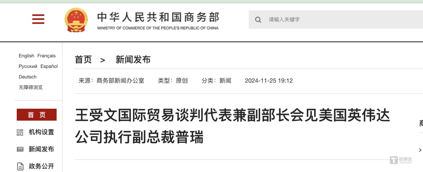 有趣的是,就在11月25日,商务部国际贸易谈判代表兼副部长王受文应约会见美国英伟达公司执行副总裁普瑞。双方就英伟达在华发展等议题进行了交流。王受文表示,中方欢迎英伟达继续扎根中国,共享发展机遇,愿听取企业诉求,为各国企业在华发展营造更好的营商环境。