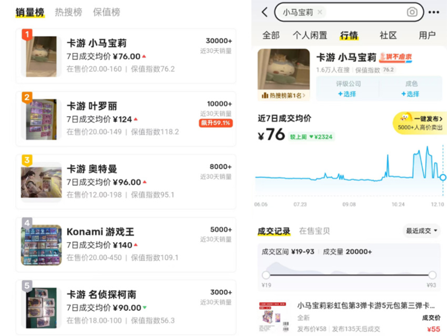 闲鱼平台数据显示,小马宝莉近30天销量超过3万,是第二名叶罗丽的3倍。在闲鱼平台上的小马宝莉7日成交均价为76元。今年7月,还曾一度传出小马宝莉某张卡牌在二手交易平台售价16万元。后续有媒体调查验证,小马宝莉在该平台的实际交易中并未出现“天价”,有可能是博取眼球的炒作行为。不过,惊蛰研究所也调查了解到,今年7月确实有一张全球限量20张的小马宝莉卡以25.5万的成交价刷新了成交价记录。