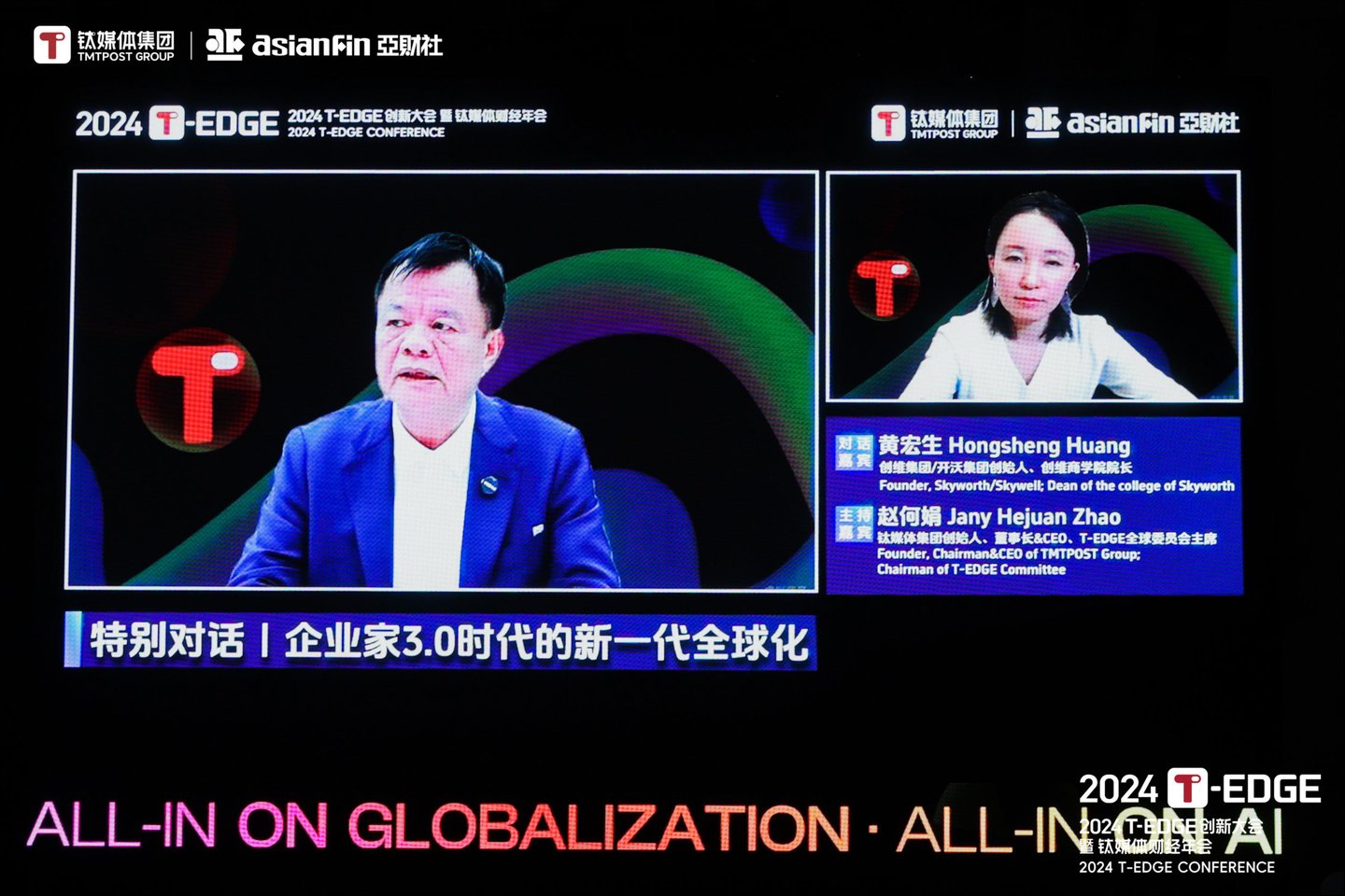 12月6日下午,创维集团/开沃集团创始人、创维商学院院长黄宏生在钛媒体2024T-EDGE创新大会上与钛媒体集团创始人、董事长、CEO赵何娟进行了一场主题为《企业家3.0时代的新一代全球化》的特别对话,探讨新环境下中国企业的全球化路径和变化、AI新能源的布局,以及新时代下的企业家价值观的变化。