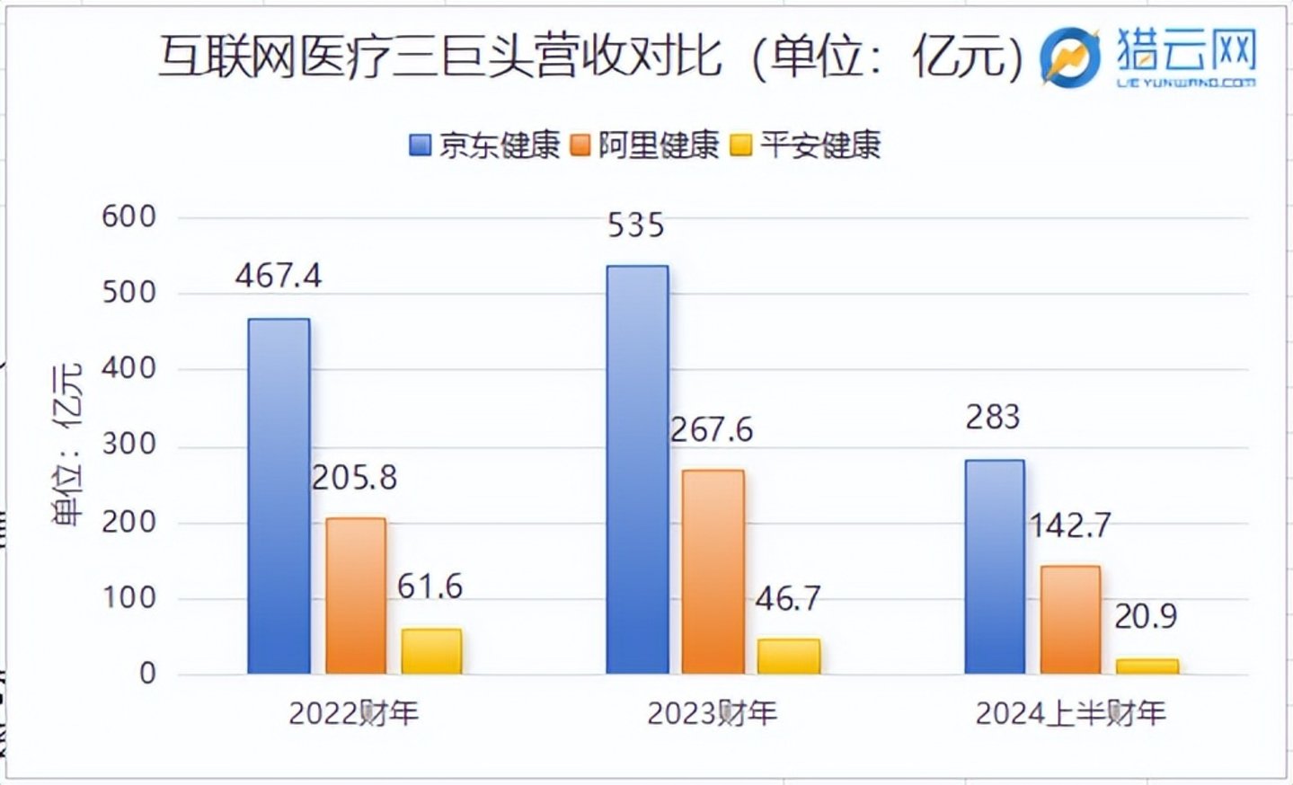 在2023财年,京东健康营收535亿,同比增长14.5%;阿里健康营收为267.6亿,同比增长30.1%;平安健康营收为46.7亿元,同比下降了24.7%。