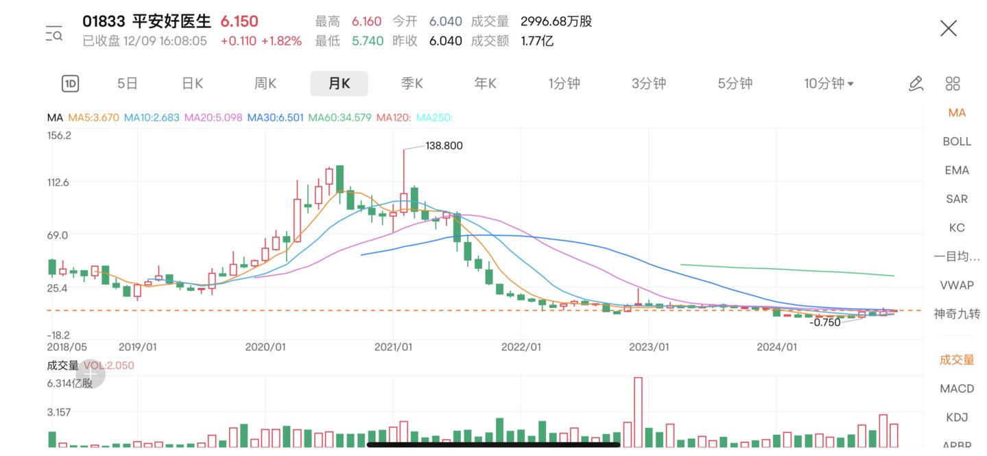 自2018年上市以来,平安好医生一路上扬,2021年最高点股价突破148港元/股后,开始就是一路下跌,至今来到了6港元左右,市值蒸发超过1000亿港元。