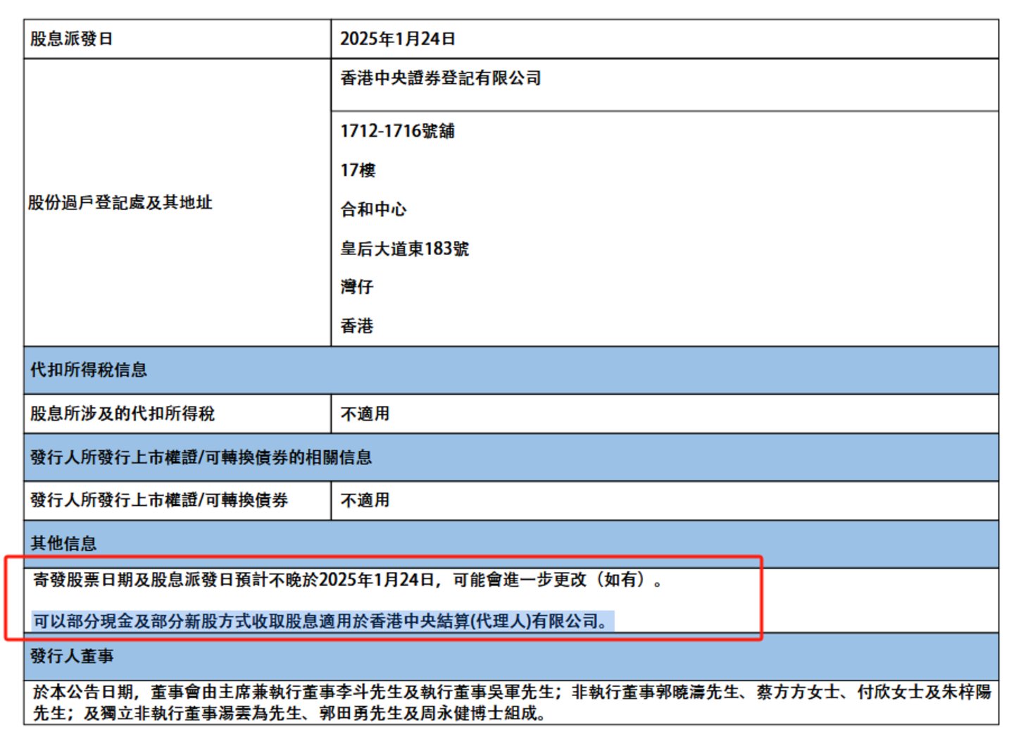 据悉,公司于12月4号召开特别股东大会,此次派息的除权除息日为2024年12月6日,派息日为2025年1月24日。本次派息可以部分现金及部分新股方式收取股息。