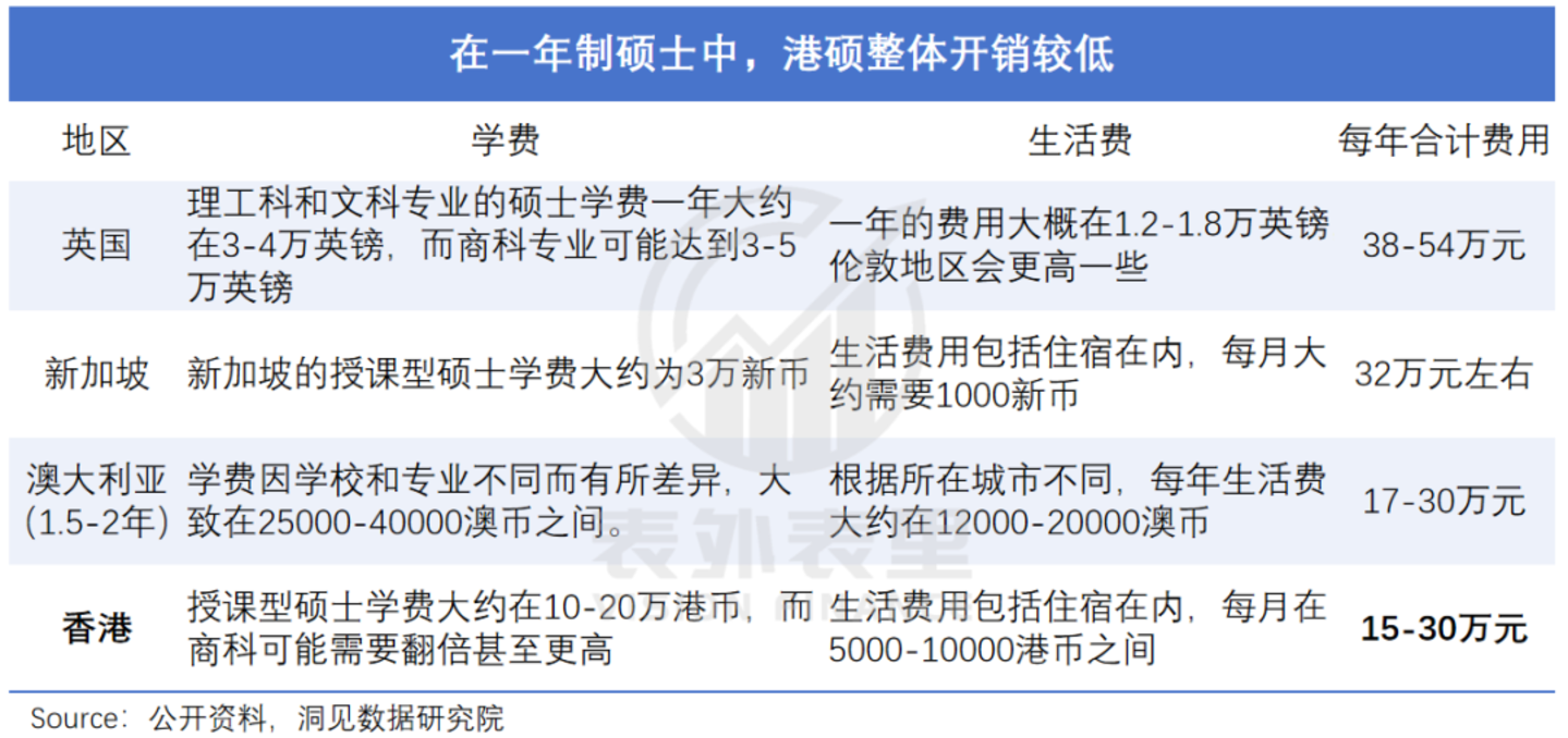 “企业招留学生,招的不只是人,还有背景和视野。”他分析道,而对比英硕、澳硕,会发现读港硕的费用近乎垫底,意味着学生家庭实力整体不如前者;同时,港校虽全英文授课,但终归是在家门口打转。