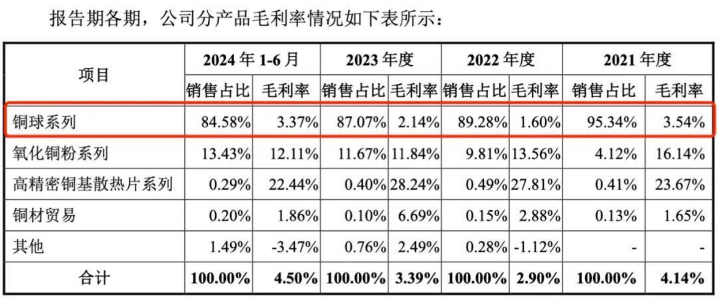 从数据看,铜球系列贡献近九成的收入,却只有3%左右的毛利率,而赚钱的是氧化铜粉系列和高精密铜基散热片等系列产品的收入却并不高。