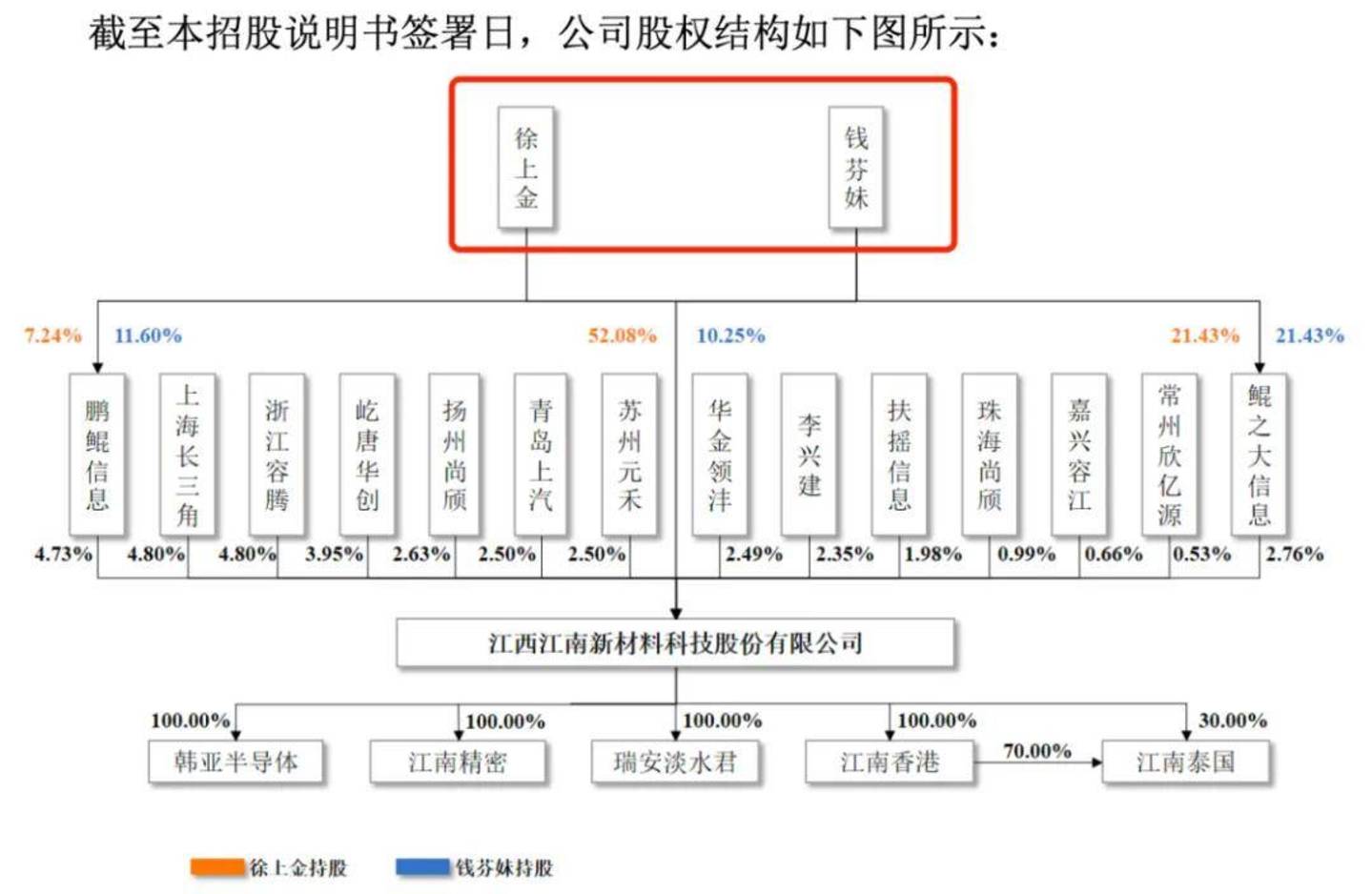 截至招股书签署日,江南新材实际控制人为徐上金、钱芬妹夫妇,二人直接及间接合计持有64.41%股份。