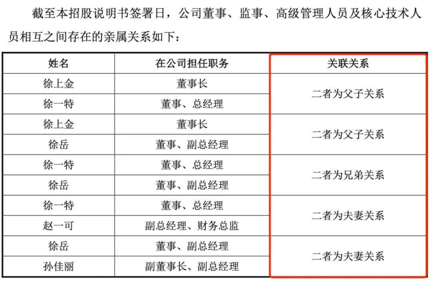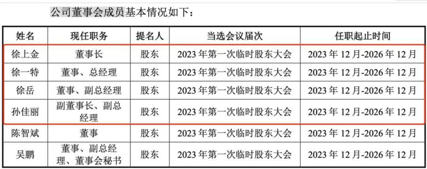 其中,徐上金大儿子徐一特担任公司董事、总经理、核心技术人员;二儿子徐岳担任公司董事、副总经理;二儿媳孙佳丽任公司副董事长、副总经理。