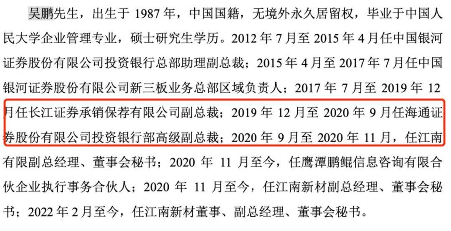 其中,2019年12月至2020年9月,吴鹏担任海通证券投行部的高级副总裁,辞职当月跳槽至江南新材,入职即进入公司核心管理层,担任副总经理、董事会秘书职务。