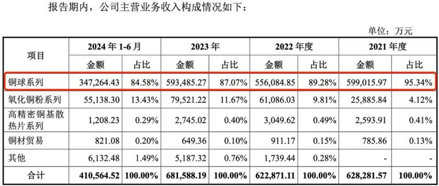 事实上,公司核心产品只有铜球系列、氧化铜粉系列及高精密铜基散热片系列。其中,铜球系列产品是公司主要收入来源。