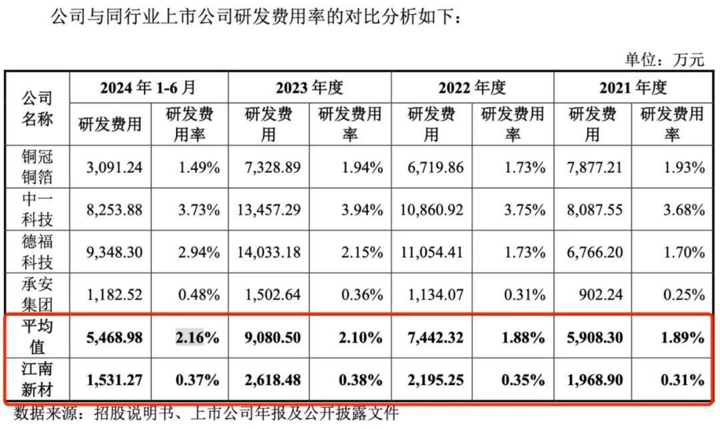 对此,江南新材对「创业最前线」表示,公司主要客户均为合作年限较久的稳定客户,对于公司已成熟的产品具有稳定的需求,公司研发费用率不高;且公司产品与可比公司中的铜箔公司存在一定差异。