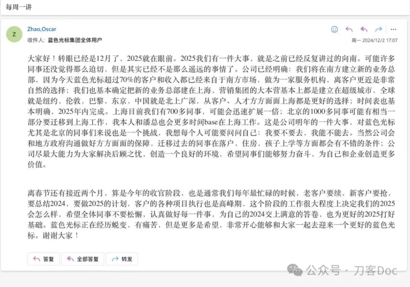 公司已经明确:我们将在南方建立新的业务总部,因为今天蓝色光标超过70%的客户和收入都已经来自于南方市场,做为一家服务机构,离客户更近是非常自然的选择;我们也基本确定把新的业务总部建在上海…………从客户、人才方方面面上海都是更好的选择;时间表也基本明确,2025年内完成。上海目前我们有700多同事,可能会迅速扩展一倍;北京的1000多同事可能有相当一部分要迁移到上海工作,我本人和潘总也会更多时间base在上海工作。这是公司明年的一件大事。